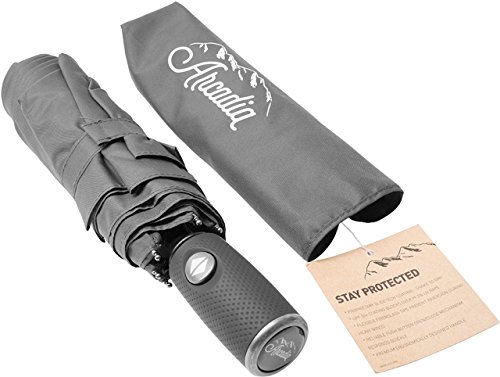 -. Brand : Arcadia Outdoors -. Department : mens -. Feature : ✓ AUTOMATIC OPEN & CLOSE - The reliable push button open/close mechanism responds quickly. Push once to automatically extend the umbrella open, press again to instantly fold the canopy closed. / ✓ GLIDETECH COATING - ProP.R.Ietary GlideTech coating wicks water away effortlessly - water droplets skid right off. Just shake to dry! / ✓ CONVENIENTLY SIZED - Your Arcadia travel umbrella is compact, light and perfect for travel. The umbrella canopy opens up to 42' and is 11' when closed. / ✓ BUILT TO LAST - The frame is constructed with stainless steel ribs and fiberglass tips to allow for maximum durability and flexibility to withstand heavy wind. A tightly woven polyester is used to craft the canopy. / ★ LIMITED TIME SALE ★ 100% SATISFACTION GUARANTEE - Backed by a 5 year warranty - just register your product on our website! We want to make sure you're happy with your purchase - Arcadia Outdoors will gladly send a full refund or replacement if you have any issue, no questions asked! -. ProductGroup : Apparel -. ProductTypeName : LAGE -. Title : Arcadia Outdoors Premium Travel Umbrella with GlideTech Coating - Compact Automatic Open Close