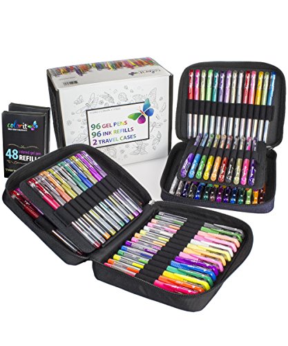 -. Title : ColorIt 96 Gel Pens For Adult Coloring Books - 2 Travel Case Gel Pen Sets with 72 Glitter, 12 Metallic, 12 Neon Plus 96 Matching Colored Gel Ink Refills
