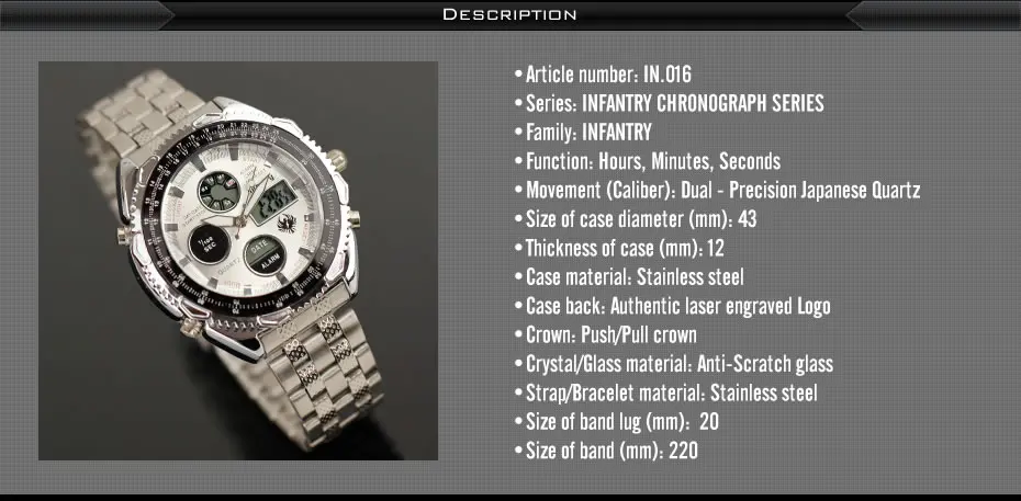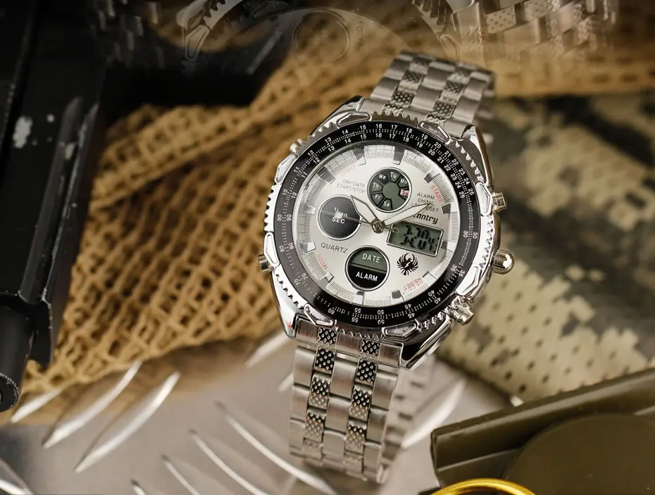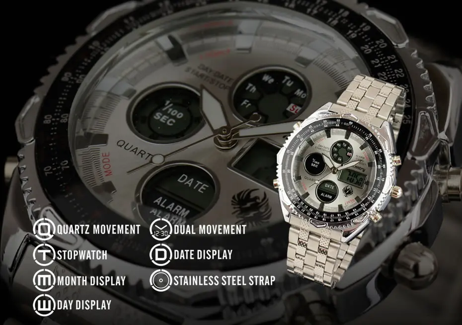 Feature:Complete Calendar,Shock Resistant,Luminous Hands,Stop Watch,LED display,Auto Date,Week Display,Water Resistant,Back Light,Chronograph,Multiple Time Zone,Alarm,Luminous