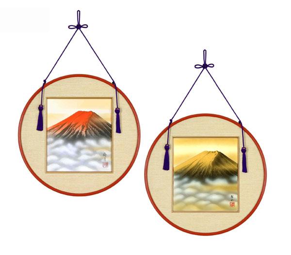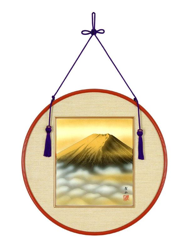 吉祥の兆しとして尊ばれているおめでたい赤富士・金富士を格式ある丸額にセットしました。お手持ちの色紙絵と差しかえも出来ます。お祝い事のプレゼントにも最適です。