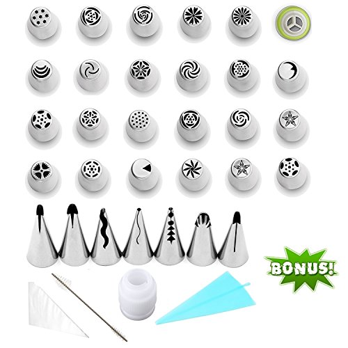 Professional Icing Decorating Bundle : Set includes 50 Pieces : 23 Professional Grade Stainless Steel Russian Piping Tips. 15 Durable Disposable Pastry Bags. 1 Large Coupler. 1 High Quality Cleaning Brush + 7 Russian Ruffle Piping Tips Set