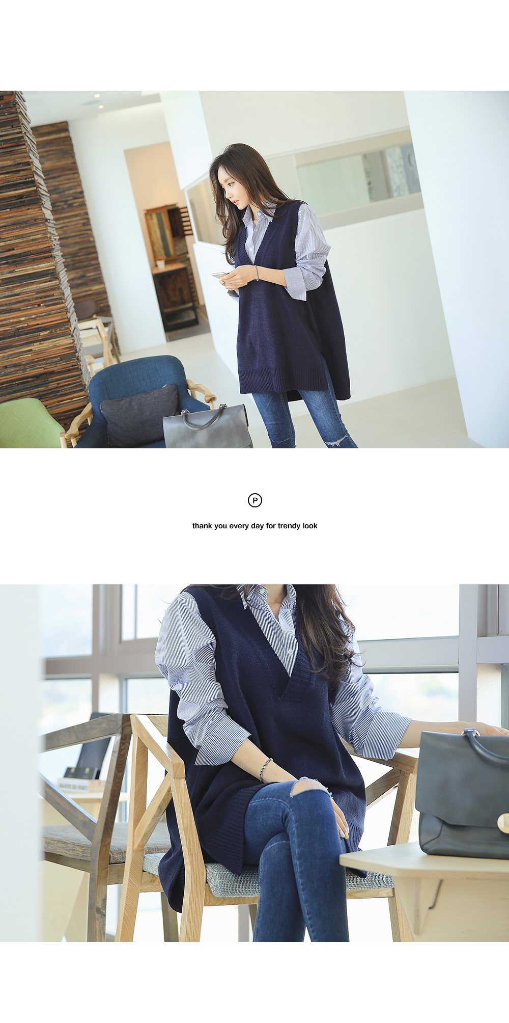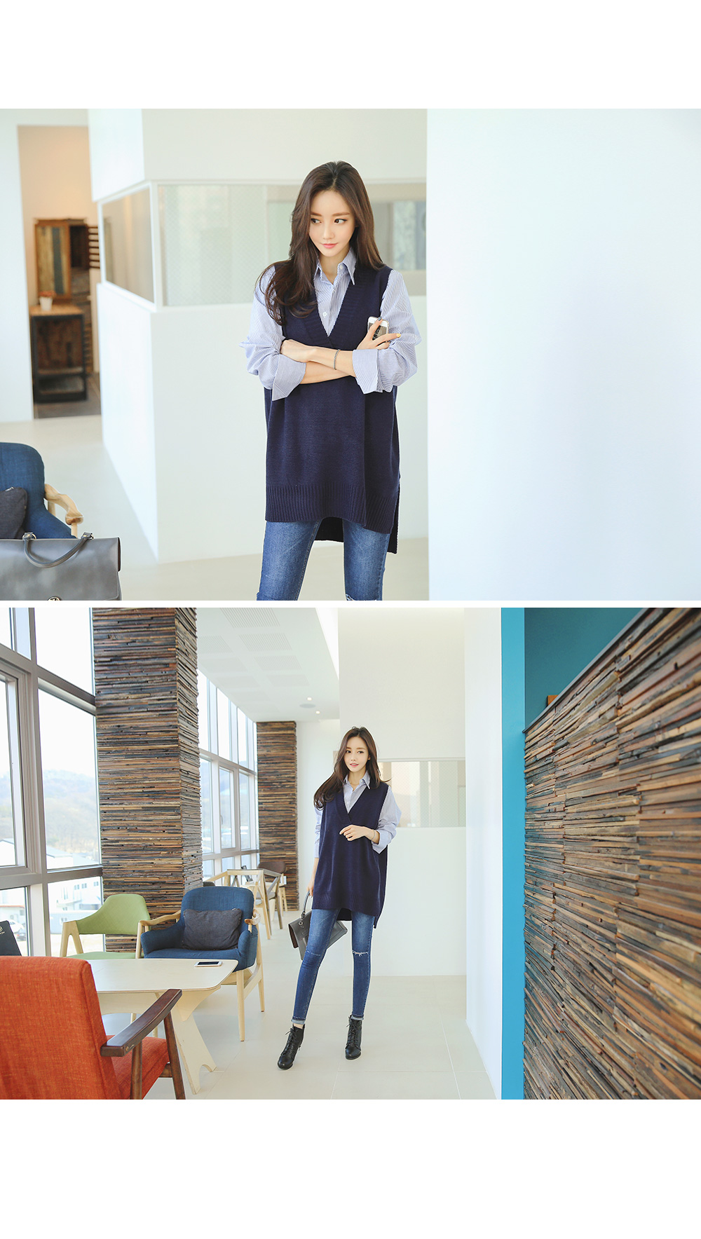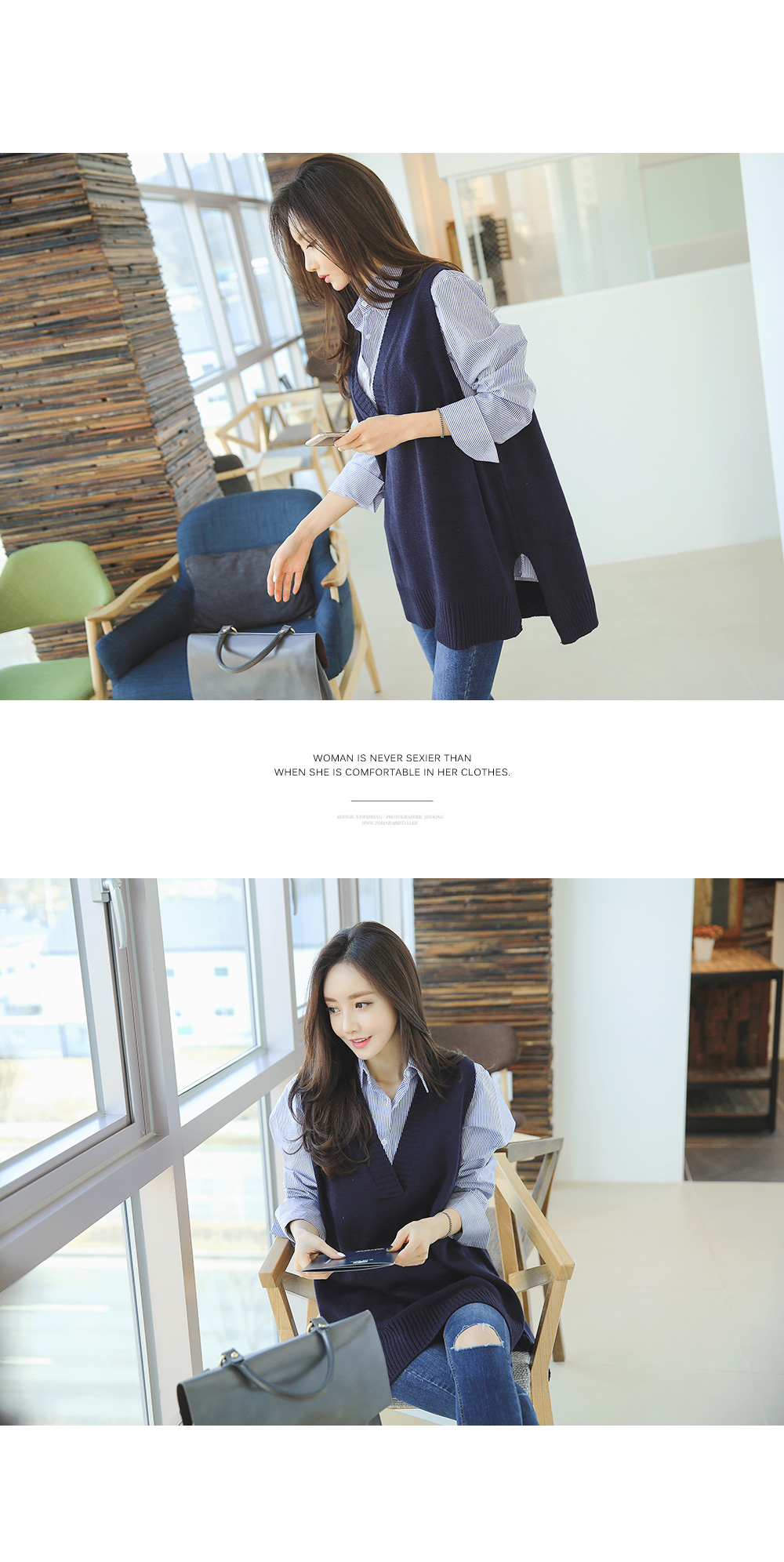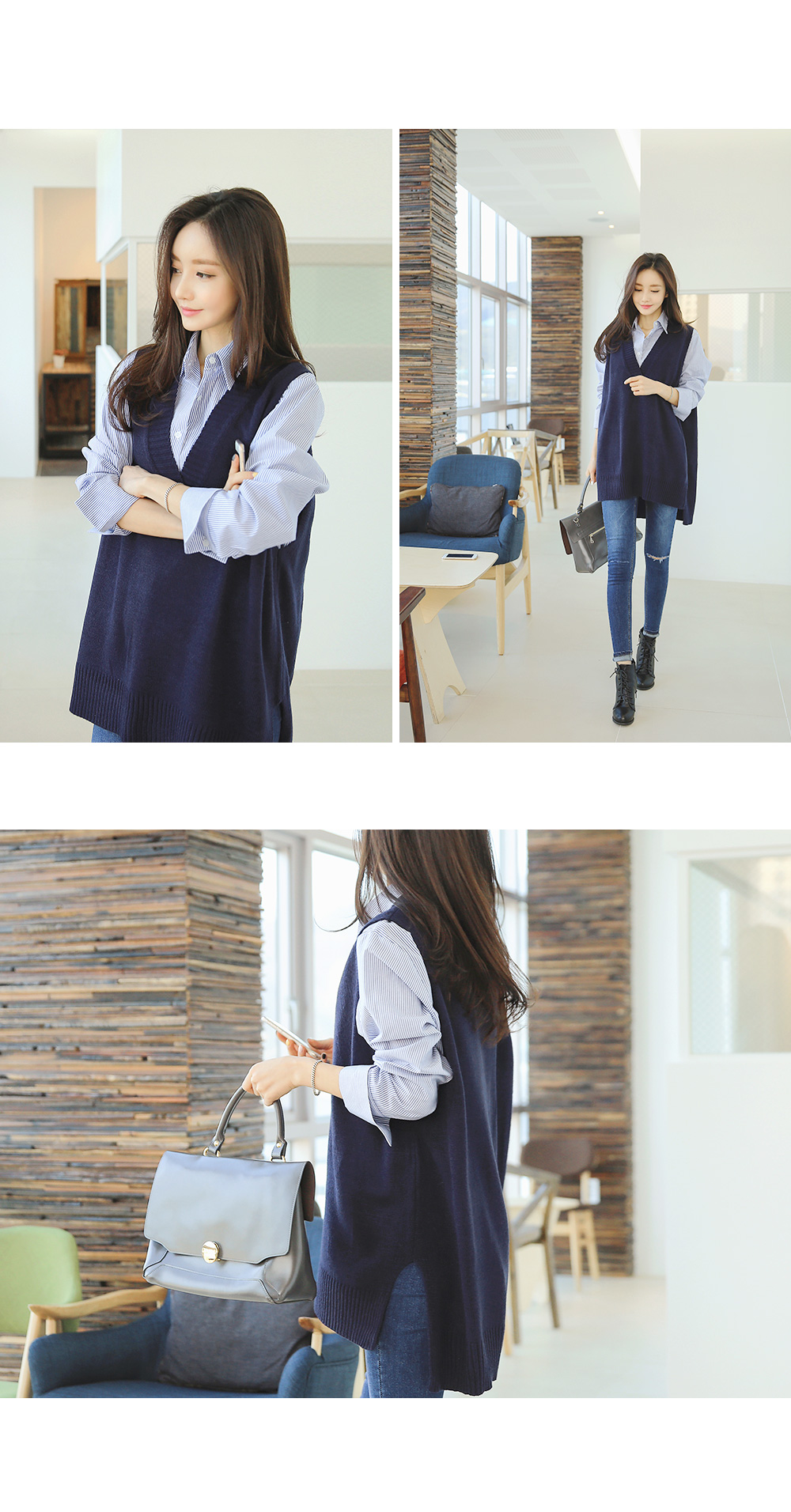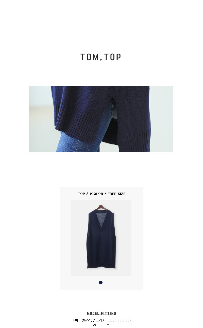 깊게 파인 브이 네크라인으로 세련된 무드를 더했으며 티셔츠나 셔츠와 함께 레이어드하여 착용하면 더욱 멋스러운 조끼 아이템이에요.
