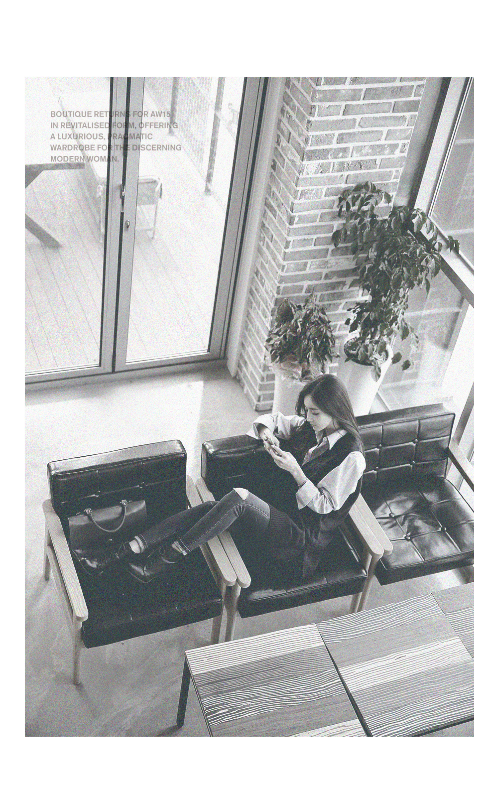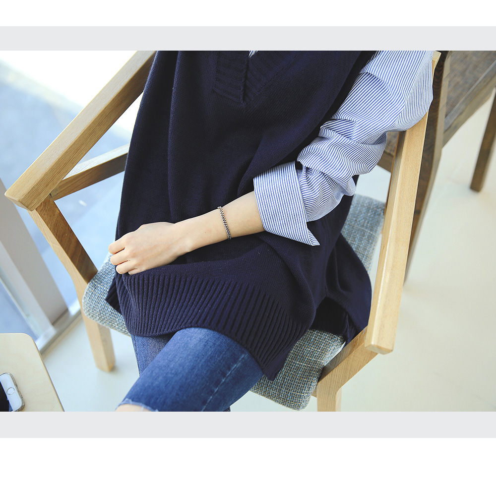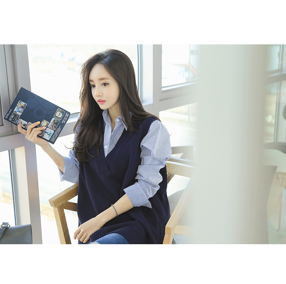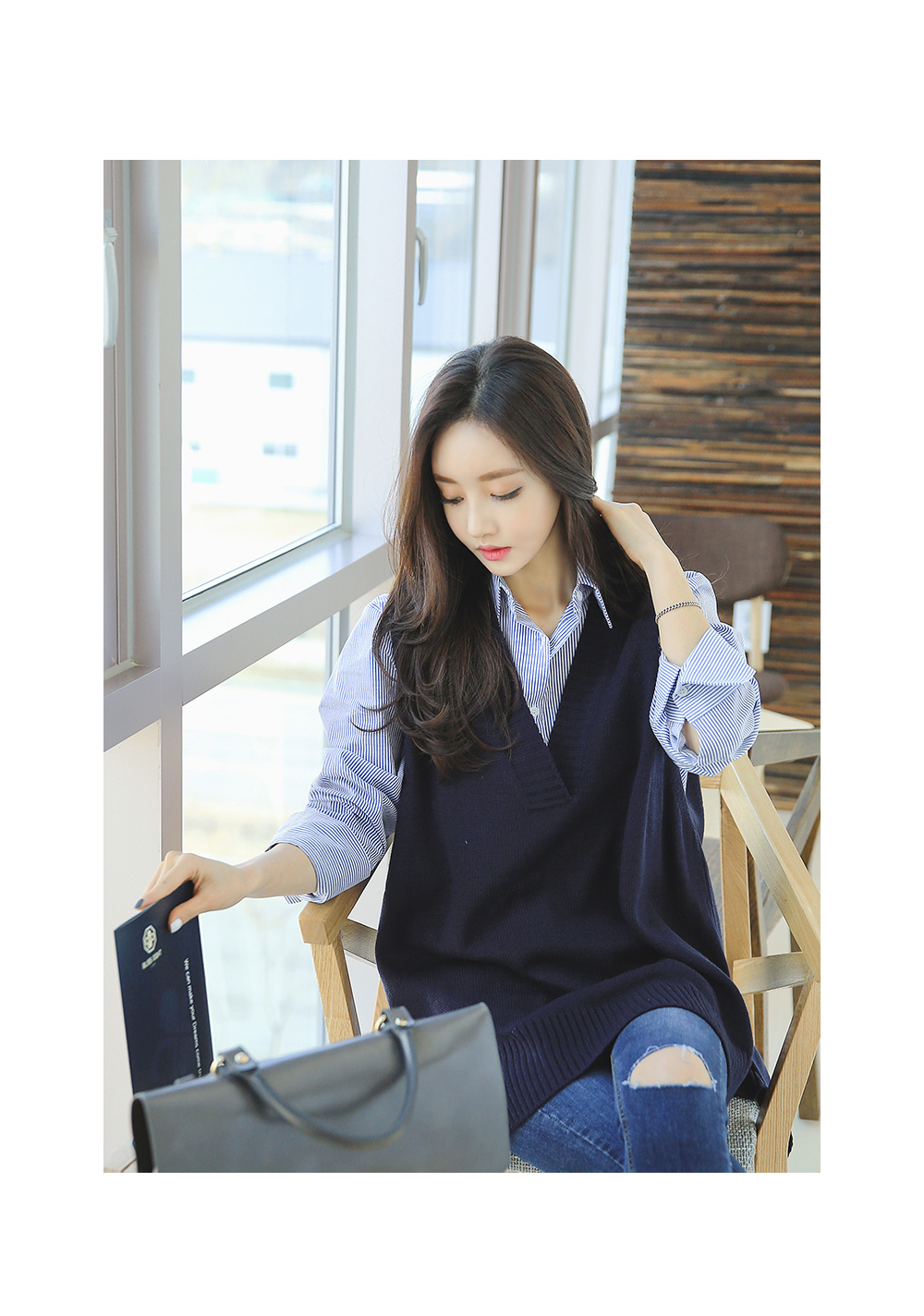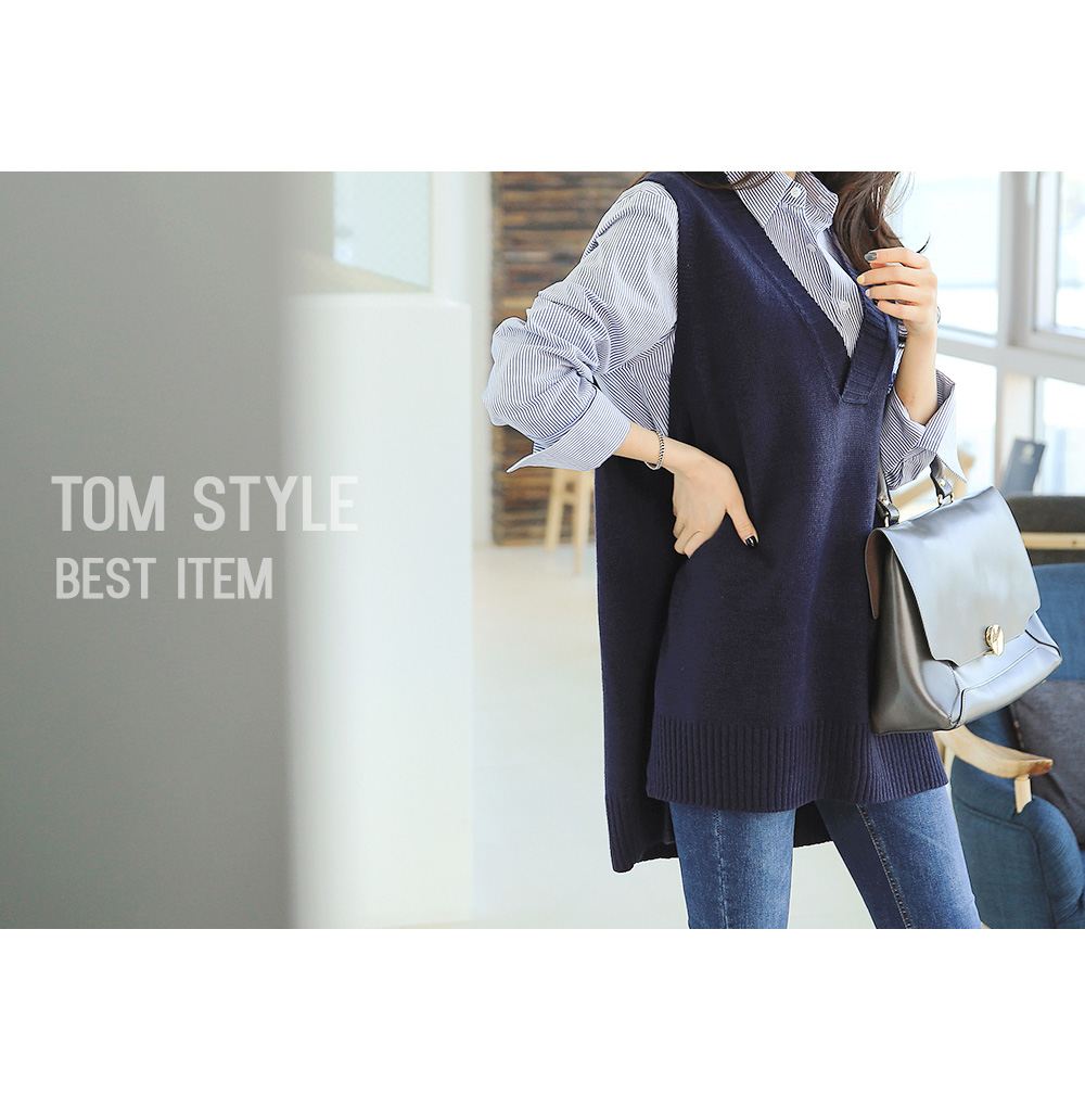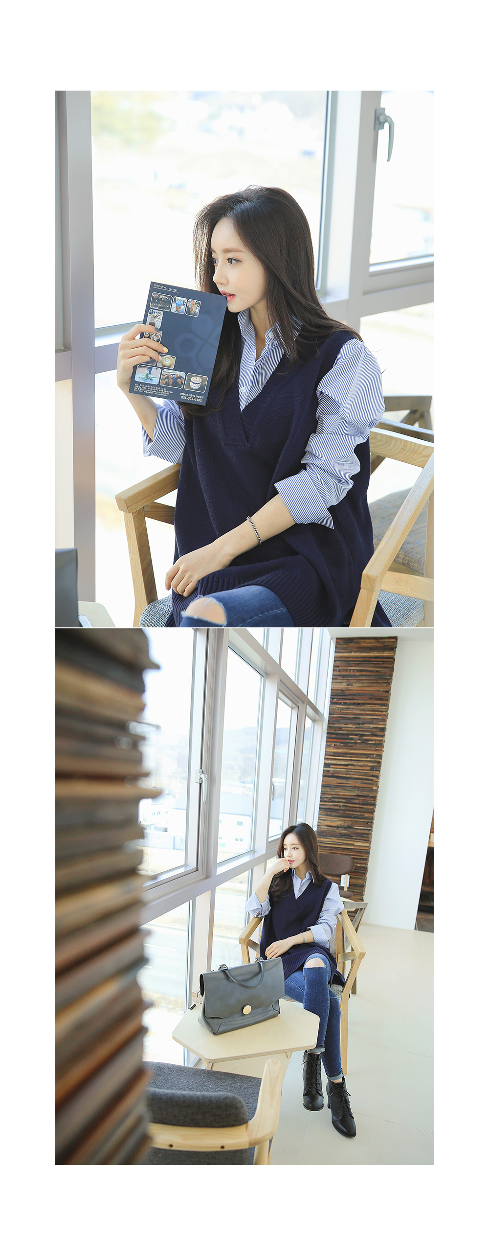 깊게 파인 브이 네크라인으로 세련된 무드를 더했으며 티셔츠나 셔츠와 함께 레이어드하여 착용하면 더욱 멋스러운 조끼 아이템이에요.