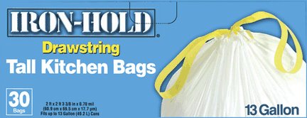 -. Feature : "IRON-HOLD" KITCHEN TRASH BAG / Drawstring / Strong .70 mil trash bag / Fits up to 13 gallon can. / White color.