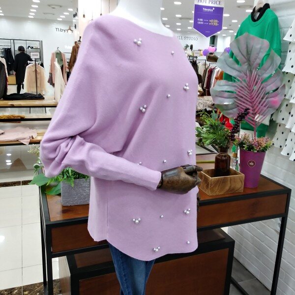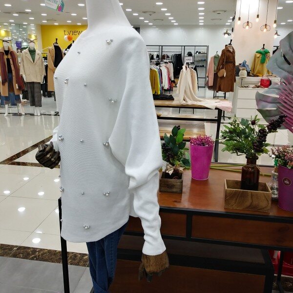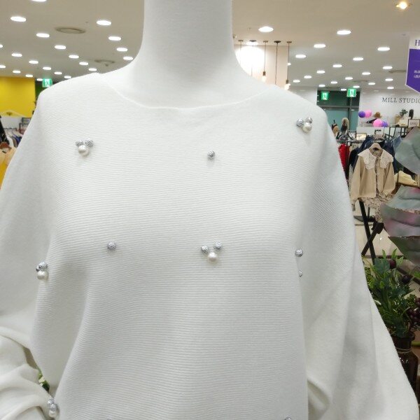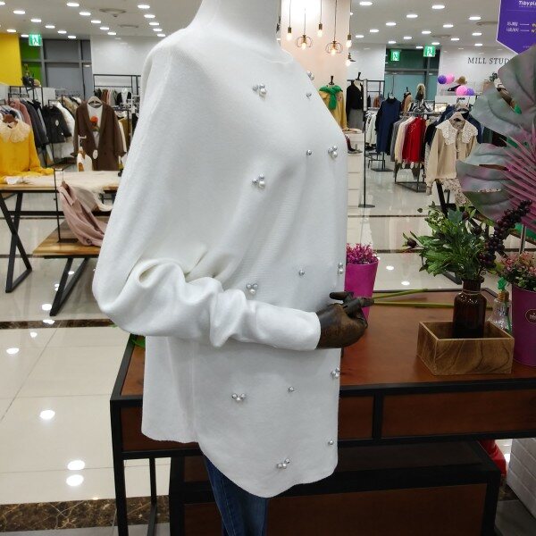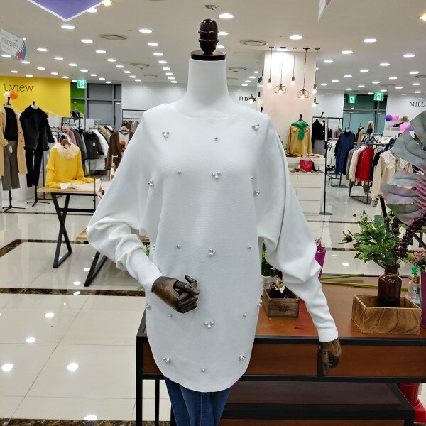 진주장식이 포인트 들어간 라운드 니트티로 기장감도 허리선 덮고 나그랑스타일의 소매라인 이에요