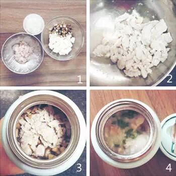 3、将所有食材倒入焖烧杯,重新倒入100℃水,盖盖子。