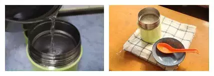 将100度的开水倒入焖烧杯,盖上盖子焖1分钟,倒掉开水,再加入食材。