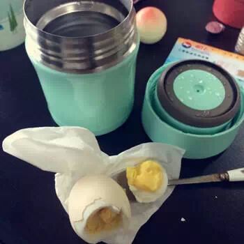 1、开水预热焖烧杯片刻,然后,将鸡蛋一只放入焖烧杯,放入开水,睡觉。