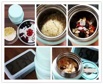 将要烹饪的食材如米、豆等提前淘好、泡开,并且在加入焖烧杯之前,浸一次热水,达到热身效果。