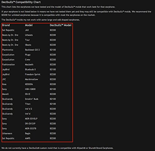 Easily and quickly molded to the exact shape of your ears, Decibullz custom earphone adapters create a perfect fit that will never hurt and never fall out. Shaping the Decibullz thermoplastic molds is easy! Simply heat the molds in hot water, snap them onto your earphones, and shape them to your ears. When done you will have a perfect fitting earphone made just for you! Decibullz are also re-moldable so you can keep molding them until you get the exact fit you are looking for. Decibullz were created so you can take your music with you no matter what you're doing. Whether it's running, working out, or relaxing at the cafe Decibullz allow you to listen to what you love while doing what you love. Compatibility: The Decibullz Adapters are only compatible with standard earphones that use silicone tips and have a straight nozzle. If your earphones are not listed they have not been tested and may or may not be compatible. BZ100 Compatibility The following earphones have been tested and will fit the BZ100 adapters. -Jaybird Blue buds X -Jaybird Freedom Sprint -Plantronics Backbeat GO 2 -Sony: HBH-IS800 -Skull candy Smoking' Buds -Skull candy Titan -LG Tone Pro HBS-750 -LG Tone Ultra HBS-800 -Samsung Galaxy S4 Earphones -Samsung Galaxy S5 Earphones BZ200 Compatibility The following earphones have been tested and will fit the BZ200 adapters. -Soul Republic JAX -Soul Republic AMPS -Beats by Drew Ur Beats, -Beats by Drew Tour -Ear pollution Plugs -Ear pollution Crew -JVC: Marshmallow The following earphone brands are not compatible with Decibullz adapters: Shure, Kirsch, Bose and Apple. Note: While the Decibullz Molded Earphone Adapters will improve the comfort and fit of your earphones they may not improve sound isolation and may change sound quality. If you are looking for improved sound quality and the best noise isolation check out the Decibullz Contour Custom Molded Earphones.