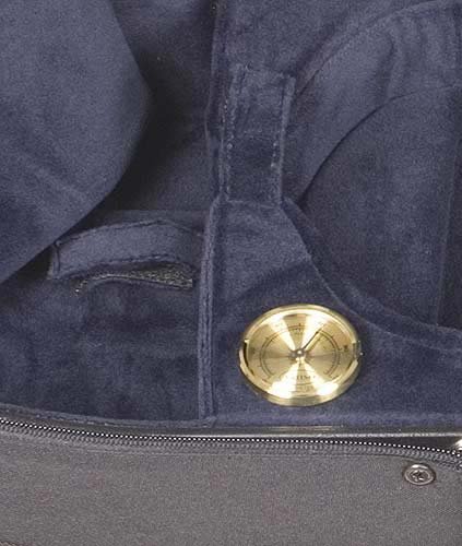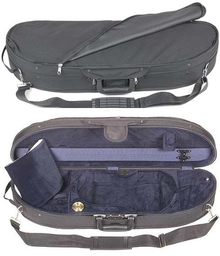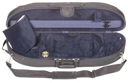 -. Feature : Black exterior with blue velour interior with suspension / A beautifully designed and economical case / Hygrometer, humistat, two bow holders, velcro neck restraint, blanket and accessory pocket / Screw attached canvas cover with music pocket, D-rings, subway strap and shoulder strap / 4/4 violin size