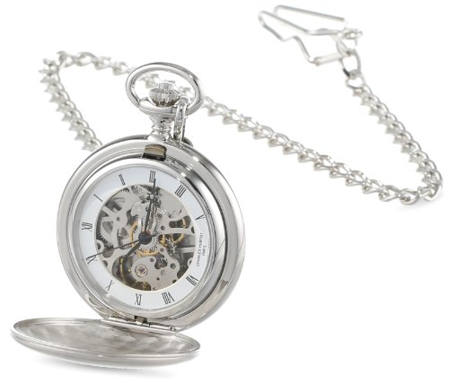 -. Feature : Chrome satin finish brass 41mm hunter case with a matching curb chain / Skeleton dial with roman numerals / 17 jewel mechanical movement / Deluxe gift box