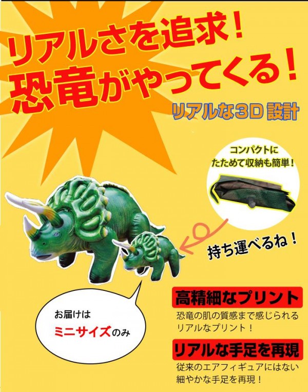 | リアルな3D設計による細かな手足や高精細なプリントのエアーダイナソーです。子供部屋はもちろん、お部屋のインテリアやお店のディスプレイにもおススメ♪たためて収納も簡単です!! |