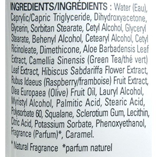 IngredientsWater (Eau), Caprylic/Capric Triglyceride, Dihydroxyacetone, Glycerin, Sorbitan Stearate, Cetyl Alcohol, Glyceryl Stearate, Behenyl Alcohol, Cetearyl Alcohol, Cetyl Ricinoleate, Dimethicone, Aloe Barbadensis Leaf Extract, Camellia Sinensis (Green Tea/th vert) Leaf Extract, Hibiscus Sabdariffa Flower Extract, Rubus Idaeus (Raspberry/framboise) Fruit Extract, Olea Europaea (Olive) Fruit Oil, Lauryl Alcohol, Myristyl Alcohol, Palmitic Acid, Stearic Acid, Polysorbate 60, Squalane, Sclerotium Gum, Lecithin, Citric Acid, Potassium Sorbate, Phenoxyethanol, Fragrance (Parfum)*, Caramel.