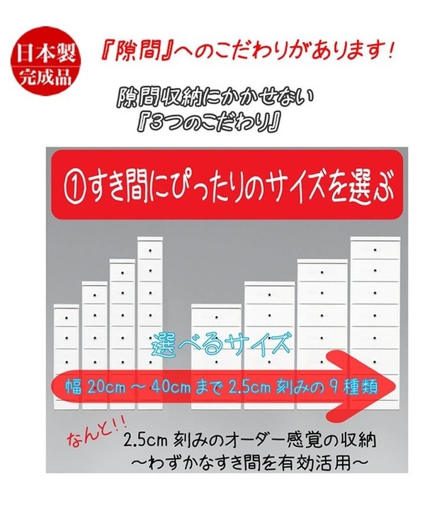 諦めていた洗濯機横、脱衣所横、食器棚横、テレビ台横、ソファー横のわずかなスキマを有効活用できる2.5cm間隔で選べるすき間家具です。