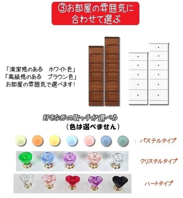 〇取っ手タイプ:本体がホワイトの場合に限り、取っ手を「シルバータイプ」「パステルタイプ」「クリスタルタイプ」「ハートタイプ」と4種類用意しております。それぞれ該当商品ページからご注文ください。