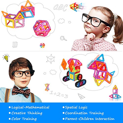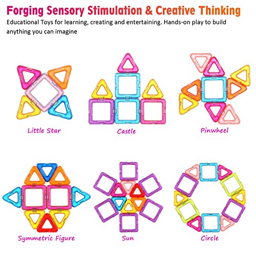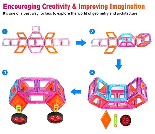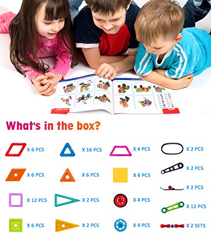 -. Feature : Learning by Playing: To develope kids creativity, help children to acquire strong sense of color, geometrical shapes including 3D forms numbers counts, magnetic polarities / Develop Multiple Skills: A educational toys, vibrant rainbow colors, free combination can develop children's fine motor development, teamwork ability, practical ability, imagination. Making kids more happier through making a cute item by themselves / Safe & Durable: Magnetic Building Blocks Playboards is constructed of HIGH QUALITY ABS material; All rainbow color blocks are gone through ULTRASONIC WELDING for stability, perfectly prevent breaking apart; Smooth Round edge of each tile without sharpness / 98 Pieces Magnetic Set: Included 16pcs * Triangle, 12pcs * Square, 6pcs * Diamond, 4pcs * Trapezoid, 2pcs * Isosceles Triangl, 6pcs * Letter Card and other construted accesorries(like wheels & connection arms,etc.), 2 different random colors on each side of each magnetic tile. An booklet included for kids easy reference to build various kinds of models. Recommending for Children ABOVE 3-Year old / Quick Clean Up: Every piece connects to another and stacks neatly due to powerful magnets so you won't find a messy pile after play! Compact storage, easy set up, and quick clean up. Perfect educational presents for school age children, preschool, pretend play and more