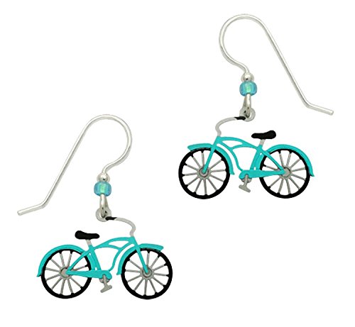 Just for fun. About 1 1/8 inches long from the top of the ear wire to the bottom of the bike charm. Sterling silver ear wires. Made in Colorado for women who want the best. Not for children under 14. Our Sienna Sky jewelry is packed in plain transparent airtight bags, then carefully wrapped in tissue and enclosed in our signature monogrammed Fluffythewondercat box. Sienna Sky is fun, casual jewelry that is comfortable to wear and crafted to last. Each piece is expertly designed by Colorado artist Barbara MacCambridge to capture her love of animals and nature. You'll also find many other designs that reflect her appreciation for the whimsical and fun to wear. Jewelry charms are etched from a copper/nickel/zinc alloy, brass or copper. Pieces may be polished, brushed or have color applied to them. Each item is completed by adding Austrian crystals, glass beads or stones. Barbara uses only sterling silver or goldfilled ear wires and surgical steel posts.