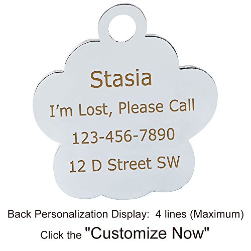 Material: Steel Metal Shape: Paw Size:Approx 1.0"x1.0"x2.0mm Order Instruction Step 1:Click the "Customized Now" button Step 2: Line 1 "Pet Name",write down your pet's name,such as "Bobby" Step 3: Line 2 "Street" ,write down your street information here Step 4:"City Zip Code",leave your city and zip code Step 5: "Phone Numb",give your phone number to us here About Shipping: 7-15 days for delivery If the item missed the delivery time, please contact us and we'll respond in 24 hours to resolve your problem.We promise a full refund or give you a replacement.