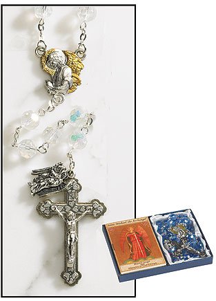 This gift set feature a beautiful crystal rosary with a two tone angel centerpiece and a dangle for each archangel.