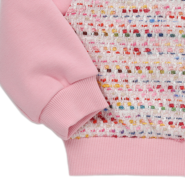 상품설명 멀티 컬러 트위드 원단과 핑크 다이마루 원단으로 구성된 배색탑 입니다. 몸판에는 안감이 들어가 있으며 소매는 편안한 다이마루 원단으로 만들어졌습니다. 멀티 컬러 트위드의 고급스러운 무드로, 멀티 컬러 트위드 스커트와 함께 세트로 코디하시기 좋습니다.