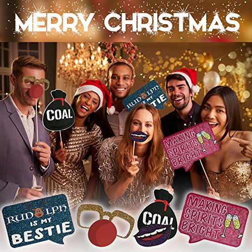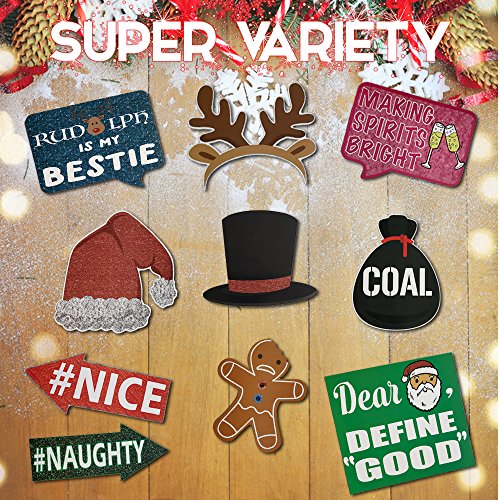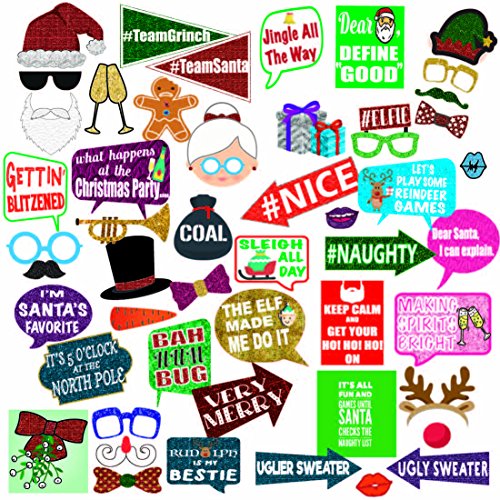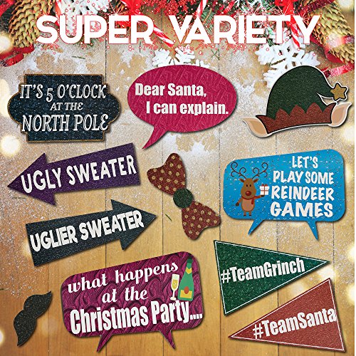 - HUGE ASSORTMENT : More props mean, more fun. You'll find something for everyone in this kit, children, teens and adults. These pieces can be used alone, or in fun combinations. You'll find eyeglasses, mustaches, hats, Santa and Mrs Clause, Rudolph, plenty of fun signs and even a bag of coal as just part of your set. Girls or boys, women or men, there's truly something for everyone to pose with.