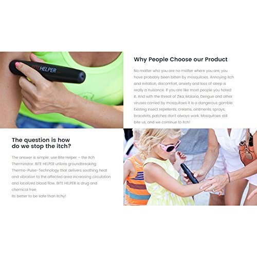 Directions : • For adults and children 4 years of age and older. Dry the affected area thoroughly before use. For best results, immediately after a bite or sting, place the BITE HELPER Thermo-Pulse metal tip directly on the affected area. Activate by pressing the On button. The red ring light indicator will light up. User should feel a gentle vibration and gradual heating sensation. Maintain BITE HELPER on the affected area for no more than 45 seconds during each application. If the heat becomes uncomfortable, remove Bite Helper from the affected area immediately.