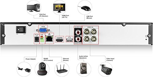 Pre-installed 1 TB hard drive records 360 hours on all 4 channels in 720p @ 30fps using motion detection or scheduled recording. Latency-free analog transmission shows activity in real-time. Transmission distance of 1,640ft (500m) from camera to DVR