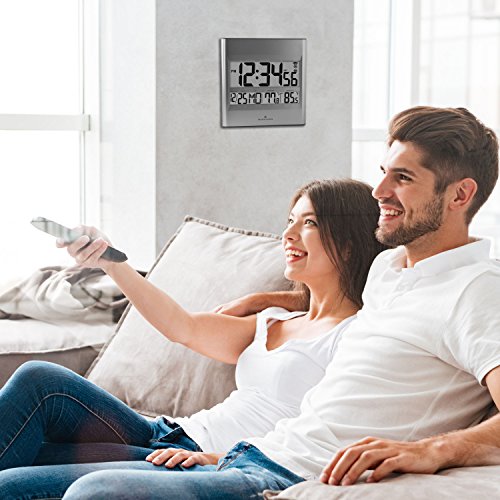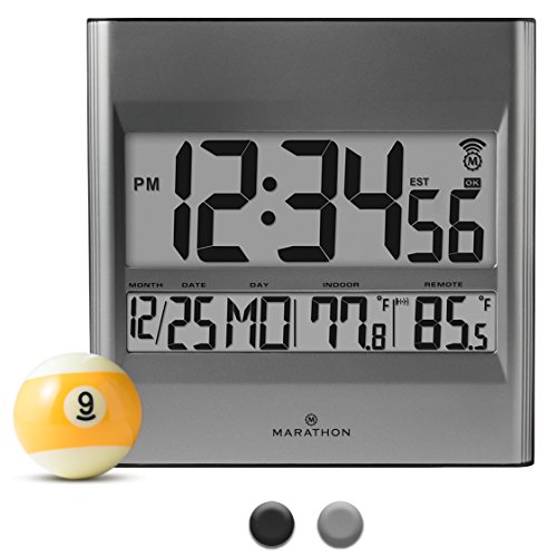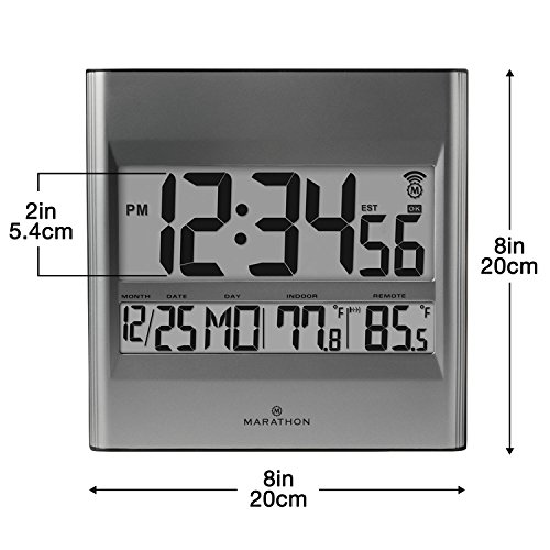 Marathon's Atomic Digital Clock with Indoor and Outdoor temperature can be wall mounted or displayed on a desktop with its built-in foldable stand, making it ideal for home, office and workstation settings. Information displayed includes: calendar, clock and temperature - all seen with one quick glance. The atomic feature calibrates time signals and self-adjusts automatically. One wireless remote sensor is included to monitor indoor / outdoor temperatures in Centigrade or Fahrenheit.