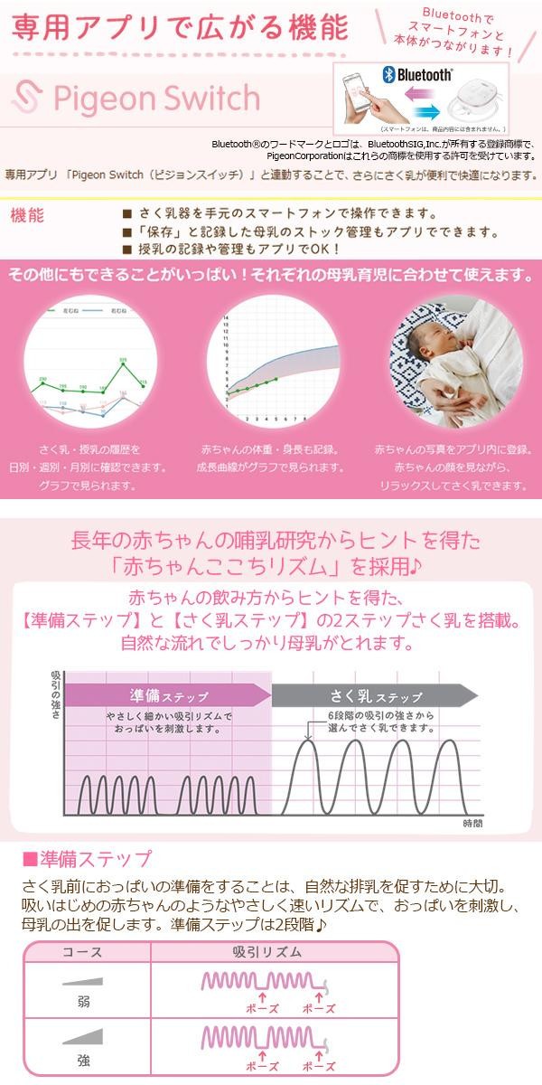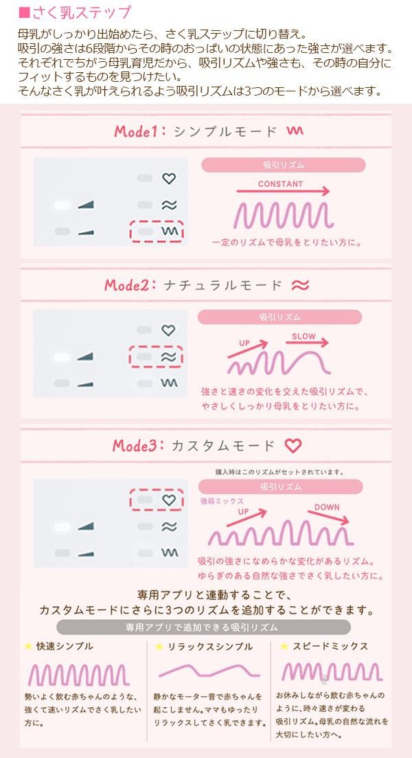 おっぱいにあてているだけで、自動でさく乳ができ、手の負担も少ない電動タイプです。その時のおっぱいの状態に合わせて様々な吸引リズムが選べるから、心地よくさく乳できます。長年の赤ちゃんの哺乳研究からヒントを得た「赤ちゃんここちリズム」を採用。専用アプリと連動することで、さらにさく乳が便利で快適になります。 |