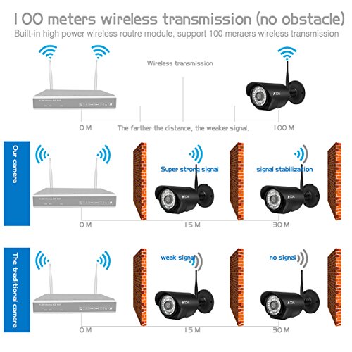 -. Feature : Plug & Play:The system will run when power on the NVR and 4 cameras in wireless mode.The camera housing is IP67 Weatherproof metal,can use in outdoor/indoor,comfortable home,office,shop,hotel,business. / Premium HD 720P Video: Get into the Details with Stunning High-def Video. View Anywhere & Anytime: Free App(IP-PRO) for Live View & Motion Alerts Via Internet, Smart Phone and Tablet with WiFi or 2G/3G/4G. / 720P(1080x720) HD Network IP Camera: More Clear & Crystal Image.NVR built-in router and two wifi antennas, the wireless can cover 1000ft in open area, up to 300ft with no obstacles.NVR also have 3 net port, you can use cable if wifi cannot cover. / Pre-installed 2 TB HDD:which records over 360 hours scheduled recording or motion detection on all 4 camera. / NOTED: The Wireless System Don't Mean You can Use the System without Any Cables. You have to Connect them to the Power Adaptors for Suppling Power to Camera and NVR.Have any questions, you may contact our customer service,We provided Lifetime professional technical support and Full 2-year warranty directly from A-ZONE.