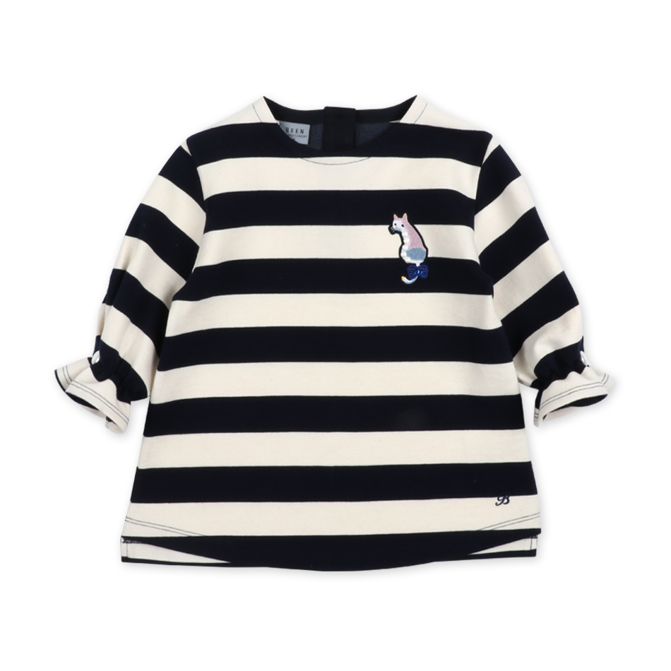 A라인으로 떨어지는 볼드한 스트라이프 느낌이 여아의 스타일링을 좀 더 고급스럽고 완성도 있게 보여주는 티셔츠 아이템입니다.