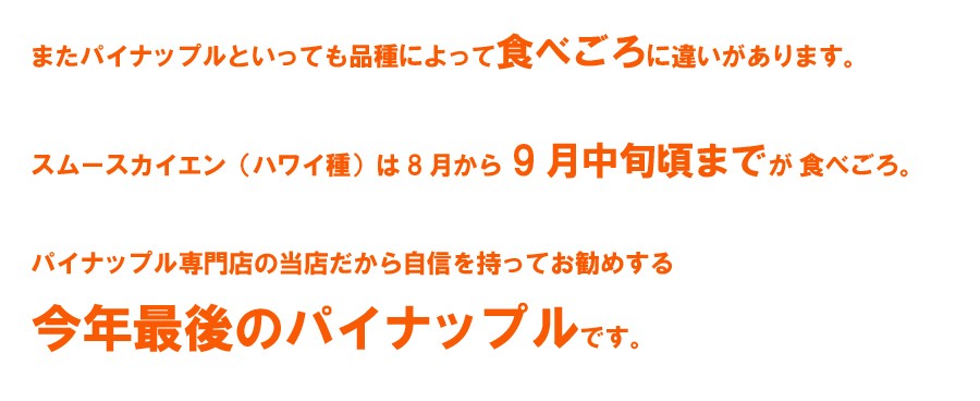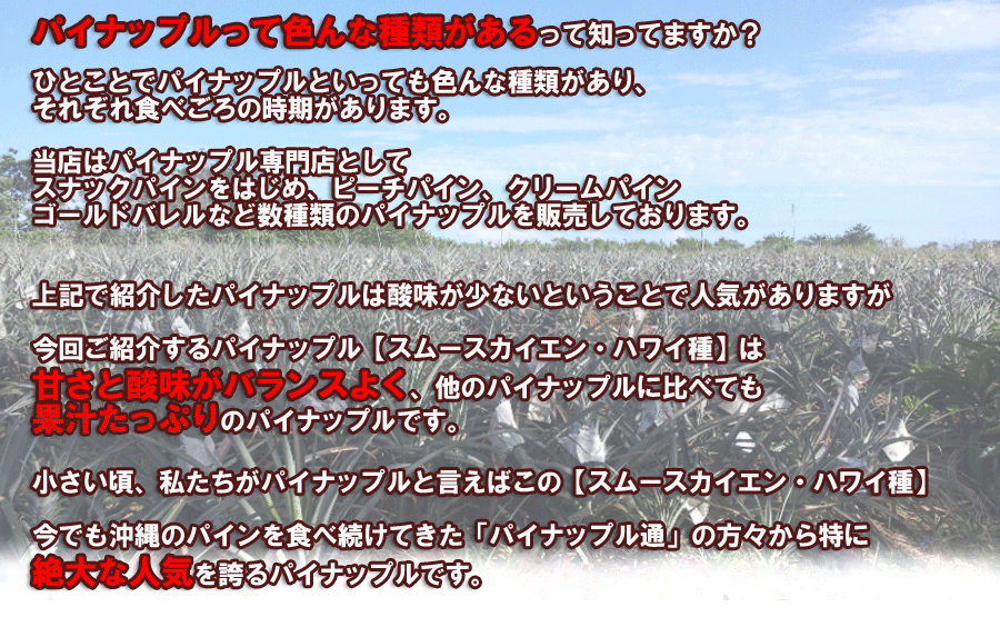 外国産や缶詰にはないパイン本来の香りと適度な酸味が楽しめます。