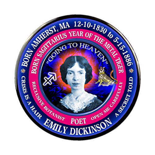 Binding : Apparel Product Description Emily Dickinson Writer 3" Pin, Astrology Sagittarius Zodiac Metal Tiger .This design is 1 of 15 female writers in a set by Valxart. Each button has writers name,place of birth, date of birth and death, astrology sign, zodiac year of birth and a few accomplishments. Look up valxart writers to find the rest. 0