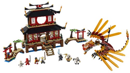 -. Feature : Includes Sensei Wu, Kai, Zane and Nya minifigures and Lord Garmadon, Samukai and Kruncha figures / Weapons include Scythe of Quakes, Nunchucks of Lightning, Shurikens of Ice, Dragon Sword of Fire, 3 golden swords, 2 silver swords, 3 black swords, 1 spear, 1 thunder bolt, 1 bone axe, 1 staff and 2 daggers / Temple splits to release Fire Dragon / Fire Dragon features spitting fire-ball action and pose able wings / 1174