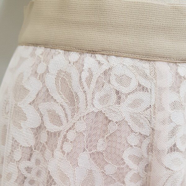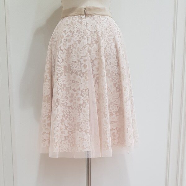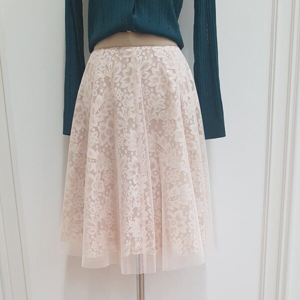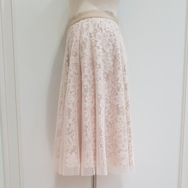 샤 소재와 레이스의 조합이 여성스러운 플레어스커트 입니다.허리 밴딩이라서 편안 합니다.