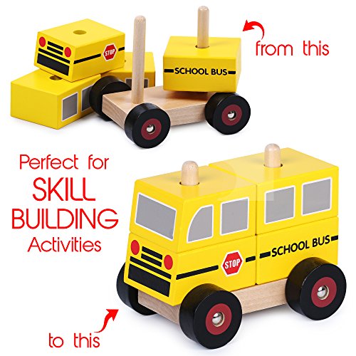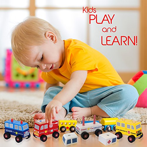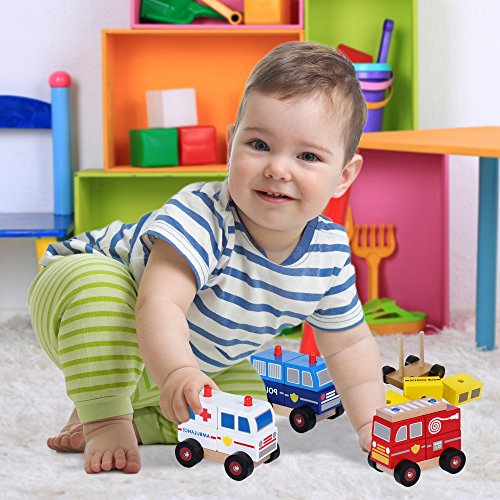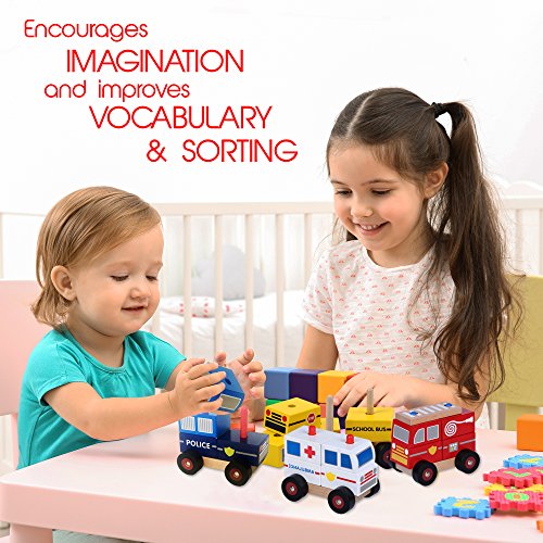 -. Feature : KIDS PLAY AND LEARN! Keep your toddlers happily busy with a premium wooden play set! Cultivate their fine motor skills, enhance their imagination and encourage cooperation to assemble the 4 wooden stacking toys! An excellent sensory educational toy your little angels will love! / EXCELLENT WOODEN CONSTRUCTION! Made of high-end wood to guarantee durability, these colorful wooden vehicles are manufactured to resist heavy use in naughty little hands. The non-toxic colors and the great attention to detail make this wooden toddler playset a top quality, LONG-LASTING choice for infants and young kids. / NO CHOKING HAZARDS! Safety is our first priority when it comes to toy sets for kids! This is why our set of stacking trucks does not include little parts that young kids would easily put in their mouth, safeguarding your peace of mind. Let them play happily in their room, the backyard or the park, alone or in the company of their friends! / THE MOST POPULAR TRUCKS THAT KIDS LOVE! Get the 4 most popular toy trucks for kids! Thrill them with a set of a police car toy, a school bus toy, an ambulance toy and a fire truck toy + 2 types of ROAD TAPES and put a wide smile on their face on all occasions! A great value set of wooden toys that makes an excellent gift! / GET THE #1 WOODEN VEHICLE SET OR YOUR MONEY BACK! We take great pride in the quality and craftsmanship of our kids' stack toy set and we know children will just love it! This is why we are backing it with 5- YEAR Full Refund Policy, making your shopping experience absolutely RISK-FREE!
