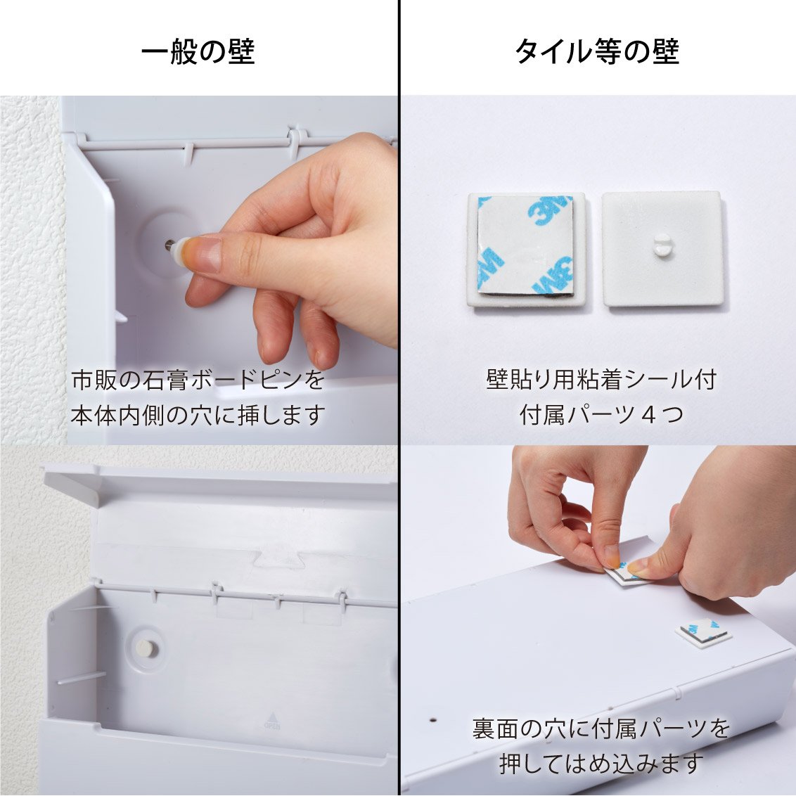 It is possible to install it on the wall with a push pin from inside, if you use the accessory parts, you can also paste it on a tile or a refrigerator and it is very convenient when putting in a paper towel