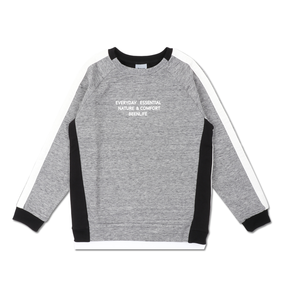 깔끔한 스웻셔츠 아이템으로 옆선이 앞으로 넘어오는 유니크한 디자인이 포인트 입니다. 소매에 아이보리 컬러의 라인을 주어 스포티하며 미니멀하게 표현된 레터링 나염 프린트가 클린하게 보여집니다. 셋업되는 BS53PT08GY와 함께 코디가능 합니다.