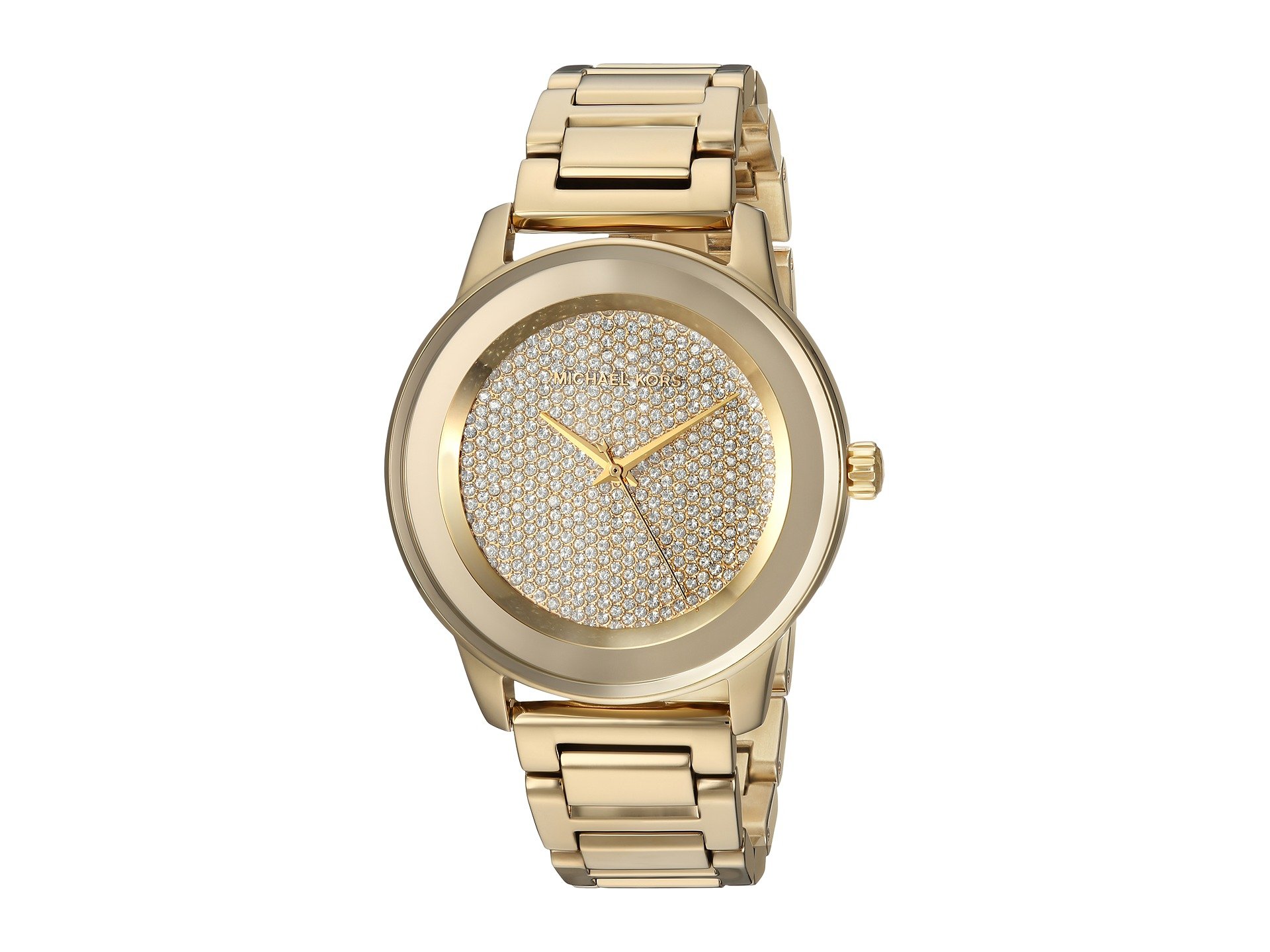 | Product Information SKU: #9010546Keep it cute and simple with this stunning Michael Kors™ timepiece.Gold-tone stainless steel case and bracelet.Fold-over clasp closure with push-button release.Three-hand analog display with quartz movement.Crystal-laden dial with brand detail and no hour markers.Polished top ring.Water resistant 5 ATM/50 meters.Imported.This product may have a manufacturer's warranty. Please visit the manufacturer's website or contact us at warranty@support.zappos.com for full manufacturer warranty details.Measurements: Case Height: 41 mm Case Width: 41 mm Case Depth: 10 mm Band Width: 20 mm Band Circumference/Length: 9 in Weight: 4.8 oz |
