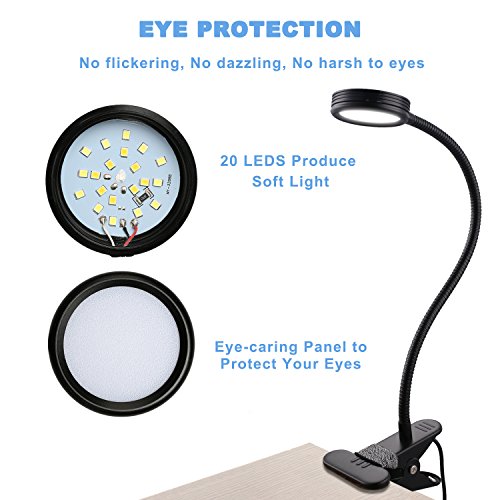- EYE PROTECTION:Our eye-care bedside reading light made of 20pcs LED bulbs produce soft light, no flickering, no dazzling, no harsh to eyes, no-radiation.What a great table lamp for reading on bed or desk.