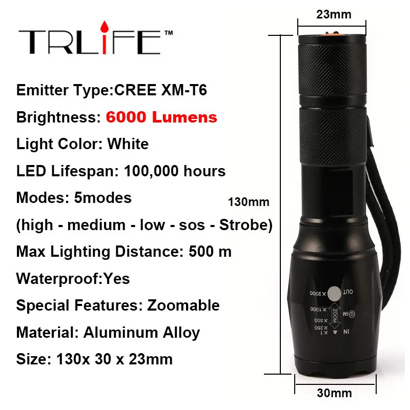 100% Authentic E17 6000 Lumens 5-Mode CREE XM-L T6 LED Flashlight Zoomable Focus Torch by 1*18650 or 3*AAA Free shipping