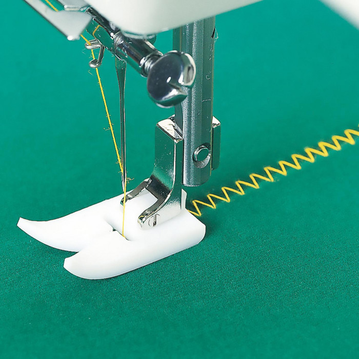 針落ち部が広いのでジグザグ縫いが可能。滑りのいいテフロンが、ニット、合成皮革、ラミネート生地といった滑りの悪い素材をスムーズに縫い上げます。