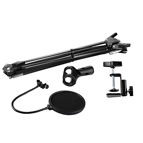 -. Feature : Material of the Scissor arm: metal, which is work with blue snowball ice, Blue Yeti, rode nt-usb, Bird UM1 / Microphone arm with solid gripping clamp, can strongly clip to any desktop up to 1.7"/4.5cm thic, max load: Approx 53oz / 2KG / This mic stand with super-strong sP.R.Ing you can easily and adjust the suitable angle & height to show your perfect voice / Pop filter with double nylon net prevent popping, flexible metal gooseneck and adjustable swivel mount / Mic boom arm suitable for any stores, families, stages, studios, broadcasting and TV stations, etc