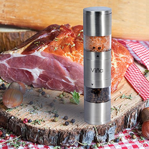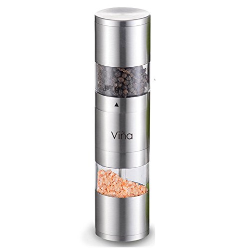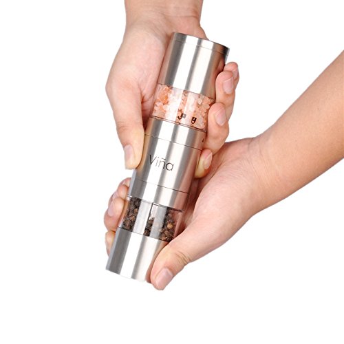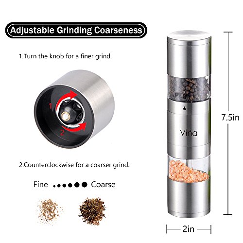 Vina Dual Manual Salt and Pepper Grinder, Stainless Steel 2 in 1 Pepper Mill Combo with Adjustable Ceramic Coarseness for Himalayan Salt, Pepper and Spices, Silver