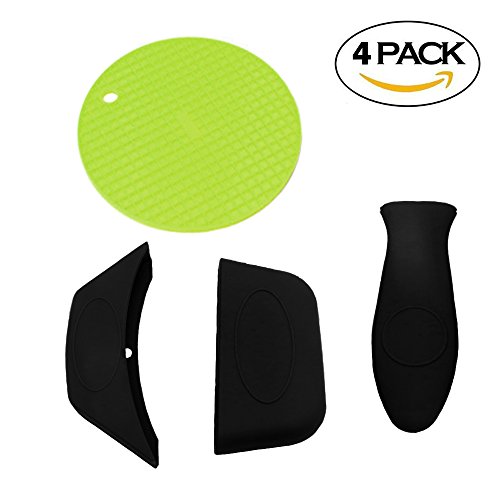 CRIVERS 4pc Silicone Hot Handle Holder, Silicone Assist Handle Holder, Silicone Hot Pad - Heat Resistant, Non Slip, Durable, Dishwasher Safe Kitchen Utensils (Black Hot Handle Holders+Green Hot Pad)