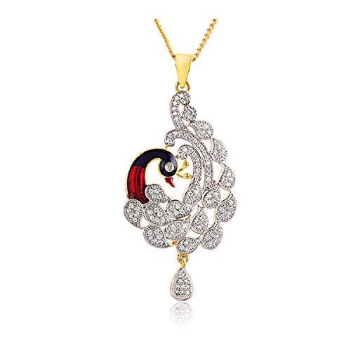 -. Feature : Swasti Jewels Sparkling Zircon Peacock Shaped Pendant Sets a perfect gift for Every Princess . Ideal Gift for Loved ones. / Style: A gorgeous beautiful american diamond traditional Pendant Set with matching Earrings. Chain is a part of the Product. / Colors: Gold with American Diamonds and Rhodium Plated. No of Items : 1 Pendant ( Size 7 cms x 3.5 cms ) with chain + 1 Pair of Earrings ( Size 3.5 cms x 1.5 cms ). / Styling tip: Wear with an ethnic outfit for any occasion. This traditional set will complement any Indian attire. Ideal Gift for Loved ones, Wife, Mother, Sister. Excellent gift for Birthday, Anniversary, Festivals and Celebrations. / Stone Creation : Simulated ; Stones: Cubic Zirconia & American Diamonds . Swasti Jewels is special and all hand-crafted in our workshops. Our contemporary designs showcase rich Indian heritage. Fulfilled by Amazon for Best Quality and Fast Delivery. Quality Produce of India.