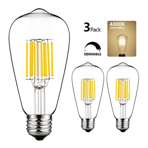 GEZEE 10W Edison Style Vintage LED Filament Light Bulb, 100W Incandescent Replacement,4000K,1000LM, E26 Medium Base Lamp, ST21(ST64) Antique Shape, Dimmable(3-Pack)