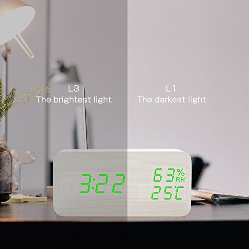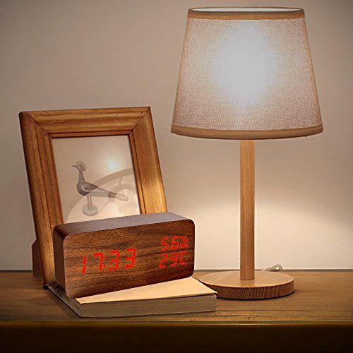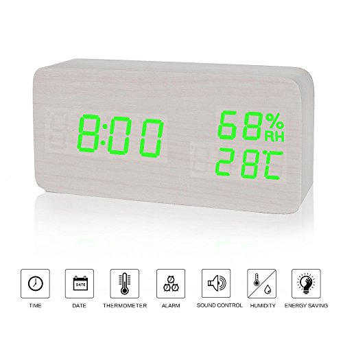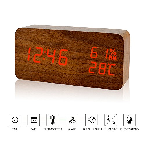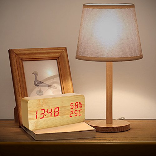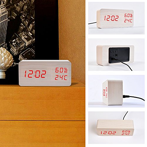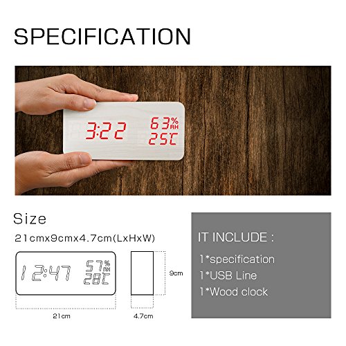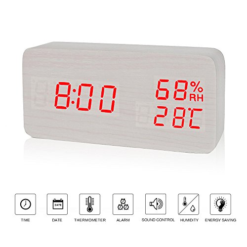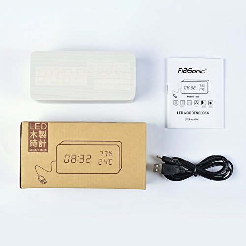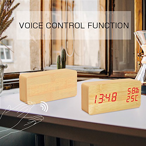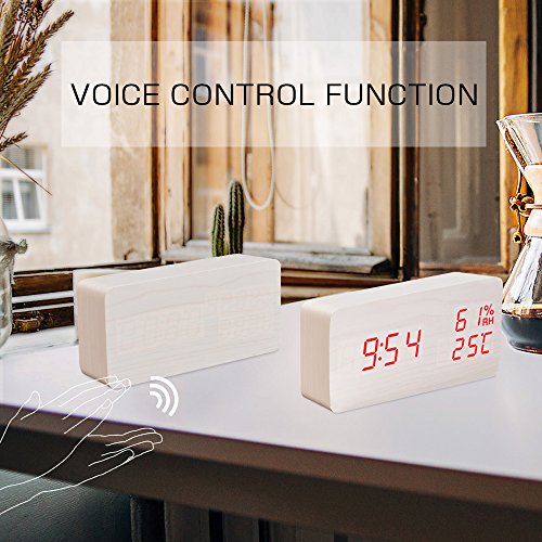 FiBiSonic Wooden Ddigital LED Voice/Touch Control White&Red Screen Desk Silent Modern Style Alarm Clock with Thermometer and Hygrometer,Best Gifts for Friends/Families