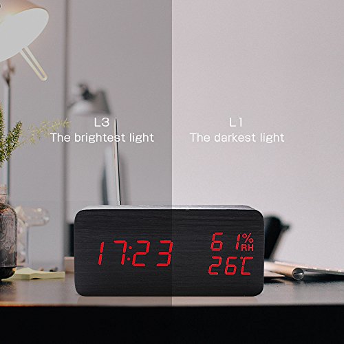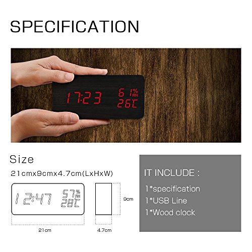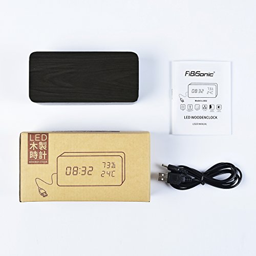 Wood Digital Clock---FiBiSonic Alarm Clock Home Slient Desk Clock Black&Red Voice/Touch Control alarm clock with Thermometer and hygrometer
